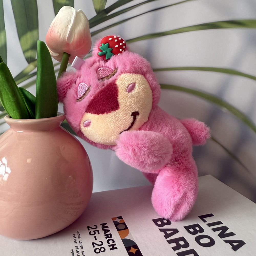 Boneka liontin beruang stroberi berbaring, gantungan kunci boneka TikTok mainan mewah tas mesin boneka garuk gantungan kunci grosir
