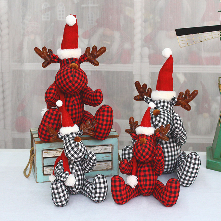 Ornamen properti jendela meja depan liburan, perlengkapan dekorasi Natal boneka rusa kain kotak-kotak merah dan hitam baru lintas batas