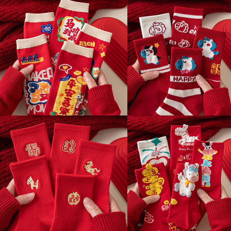 Kaus kaki merah pria dan wanita setengah betis Tahun Naga musim gugur dan musim dingin merah terang meriah kartun lucu pasangan pernikahan tahun lahir kaus kaki katun merah