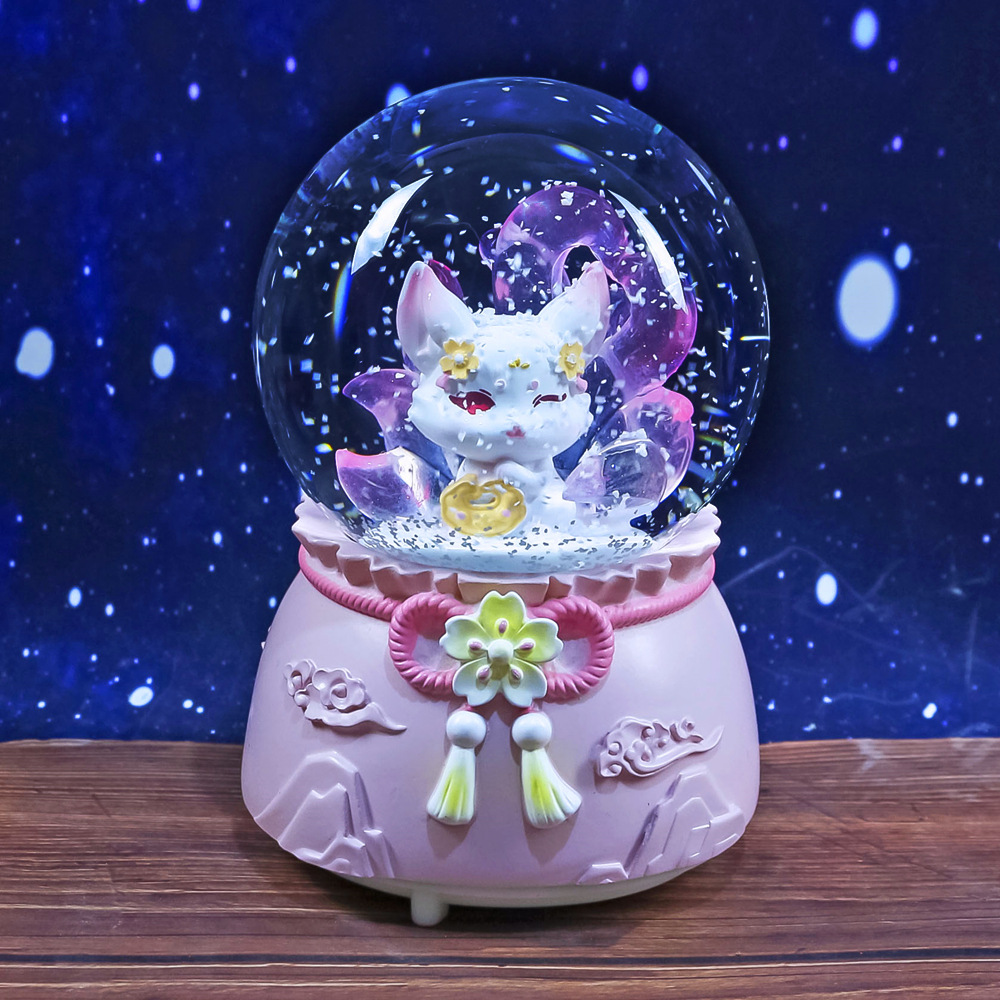 Kotak musik bola kristal rubah sembilan ekor anak perempuan dekorasi salju resin hadiah ulang tahun anak perempuan antik lucu
