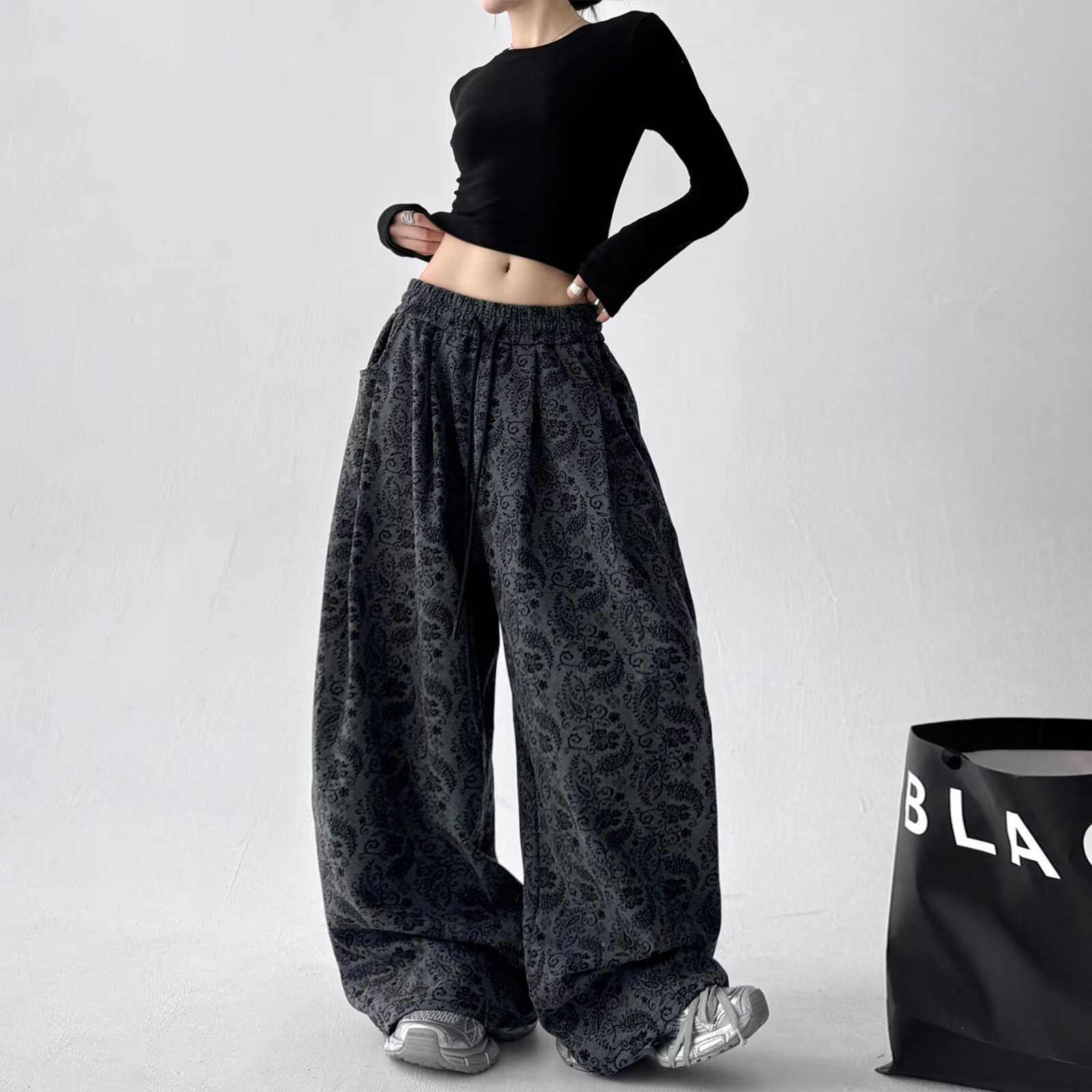 Monent celana kaki lebar wanita, Bawahan kasual longgar menggantung pinggang tinggi perempuan musim gugur