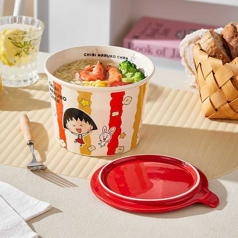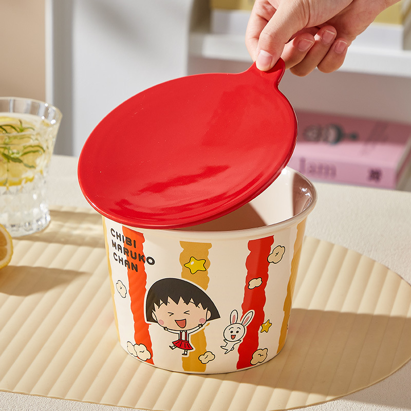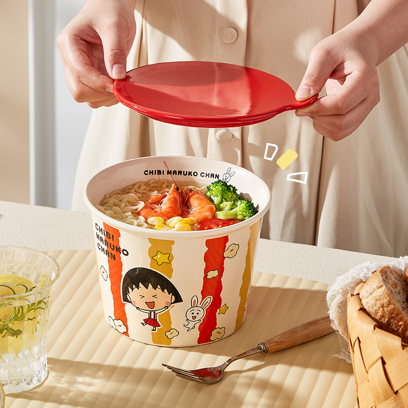 Mangkuk mie instan Chibi Maruko-chan yang lucu dan tampan, mangkuk sup berkapasitas besar dengan tutup, mangkuk besar untuk mie siput, mangkuk untuk kentang goreng