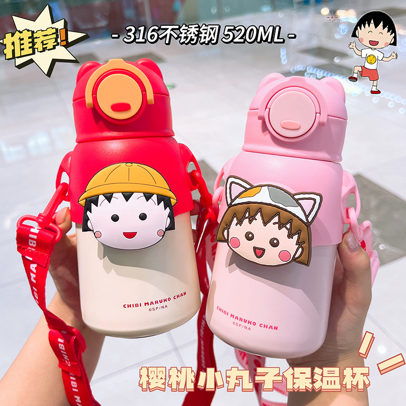 Cherry Maruko termos kartun 316 anak-anak, cangkir air sekolah portabel siswa cangkir jerami hadiah