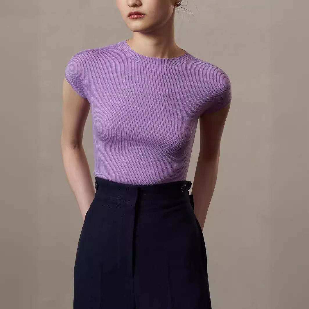 Kaus sweater lengan pendek, kaus sweater musim panas lengan pendek, lengan bahu klasik, lembut, dan menawan, tekstur seperti minyak