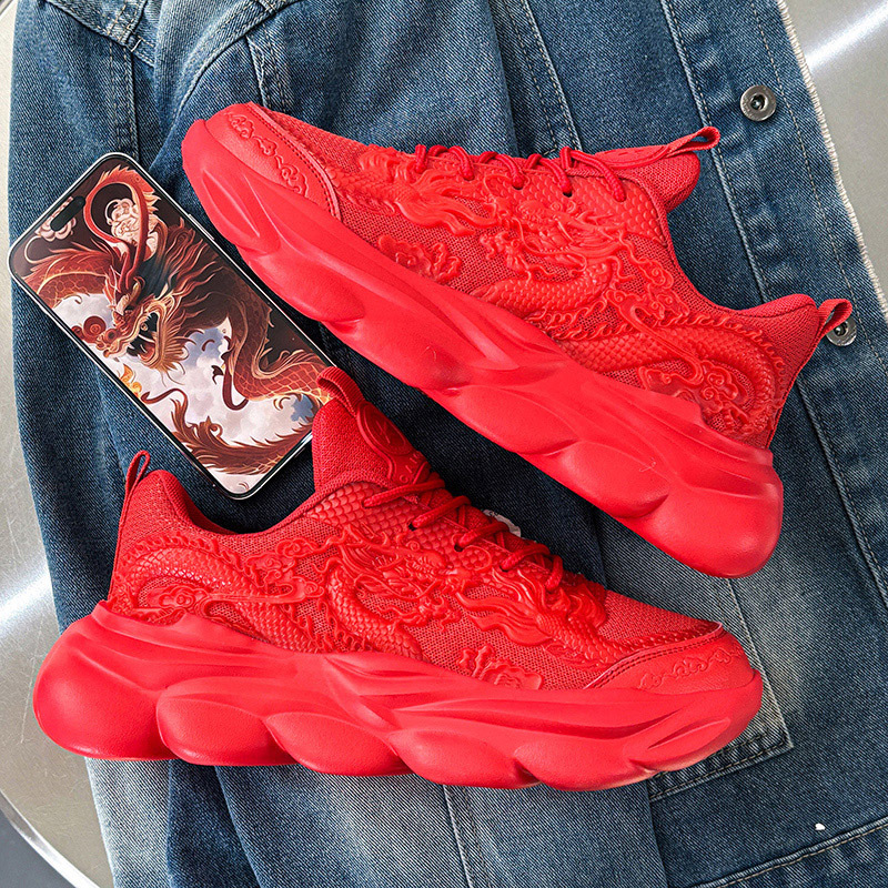 Sepatu kets tahun baru untuk pria dan wanita, sepatu sneakers tiga dimensi Motif Naga Tahun Baru, sepatu lari jaring ringan untuk pria dan wanita