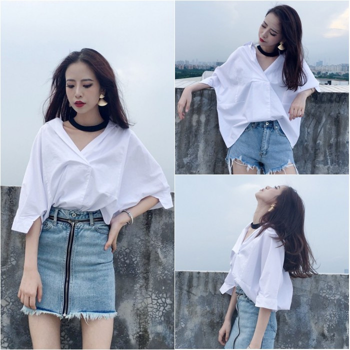 Pakaian Musim Semi dan Musim Panas Kemeja Wanita Gaya Korea BF Atasan Terlihat Langsing Longgar Mudah Dipadu Padan Pelajar BF Gantung Leher Kemeja Kerah V Warna Putih