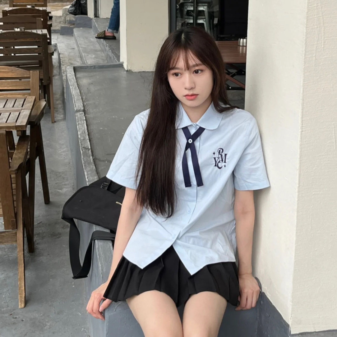 Set Seragam Sekolah Model Baru Kemeja Elegan Thailand Gaya Sekolahan Manis Kerah Boneka Lengan Pendek Baju Atasan Model Korea