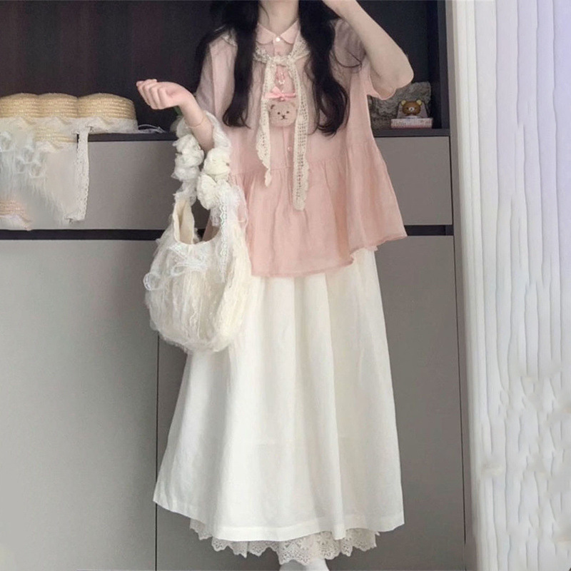 Kemeja Lengan Pendek Warna Merah Muda Sensation Gadis Sastra Prancis Rok Setengah Badan Warna Putih Jahitan Renda Siswa Wanita Dua Set