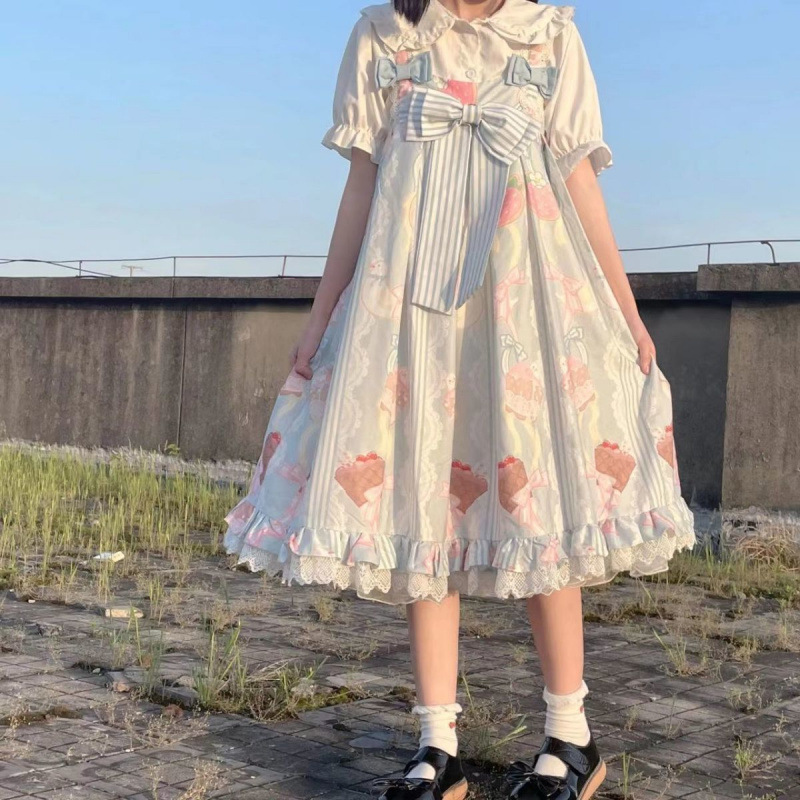 [Dua Potong/Set] Gaun Tali Lolita Pita Kupu-Kupu Gaya Jepang Manis Kemeja Kerah Boneka Pelajar