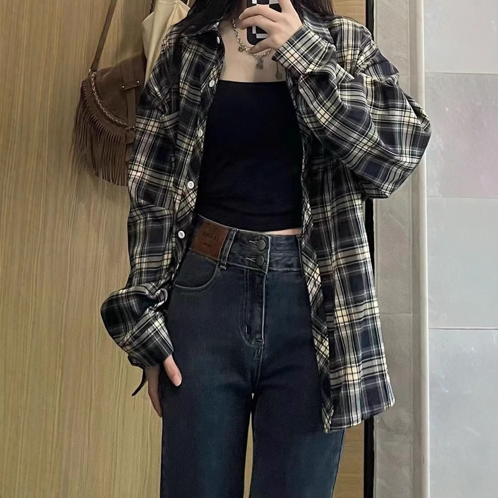 Kemeja Kotak-kotak Pakaian Wanita Musim Semi dan Musim Gugur 2025 Atasan Lengan Panjang Longgar Dipakai Gaya Pas Retro Siswa Gaya Korea