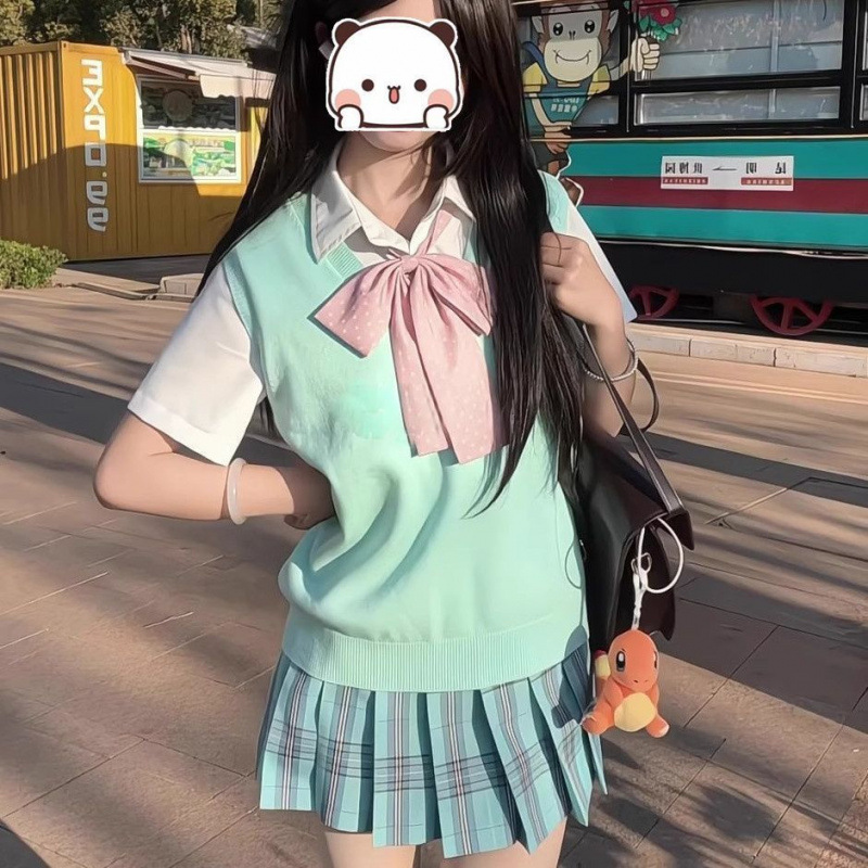 JK Rok Warna Hijau Warna Mint Seragam Rok Setengah Badan Gaya Sekolah Jepang Rok Lipit Rok Pendek Rompi Setelan Wanita