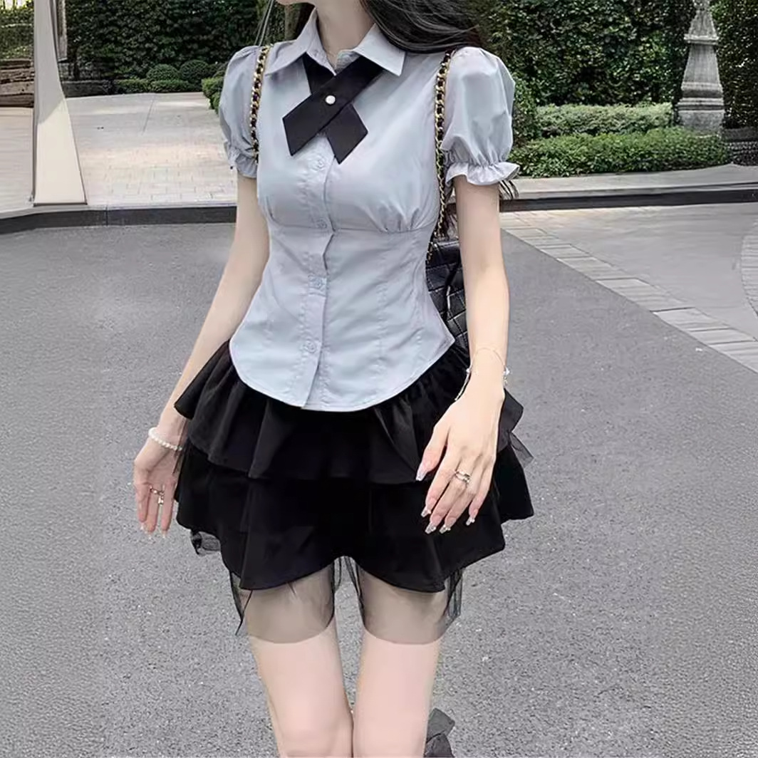 Setelan seragam JK gaya jalanan goreng manis dan pedas, kemeja lengan puff wanita, rok keinginan murni musim panas dua potong
