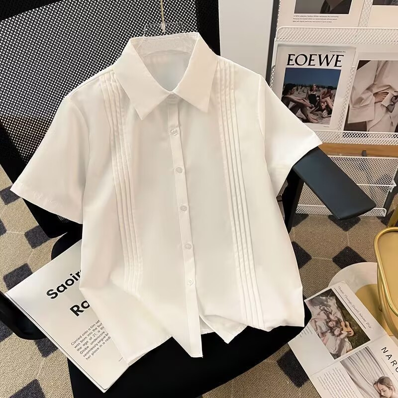 Kemeja Seragam JK Warna Putih Gaya Prancis Kemeja Kardigan Model Dasar Lipit Lengan Pendek Musim Panas Wanita Atasan Elegan Kecil