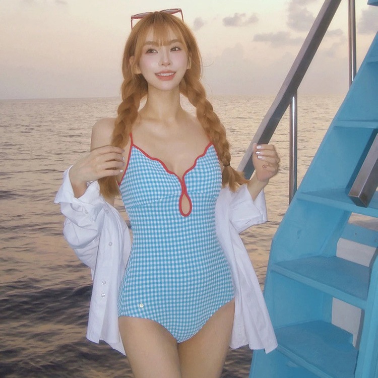 2024 baru baju renang satu potong halter tube untuk pelajar perempuan kotak-kotak Jepang penutup perut pinggang tinggi baju renang musim semi seksi pelangsing
