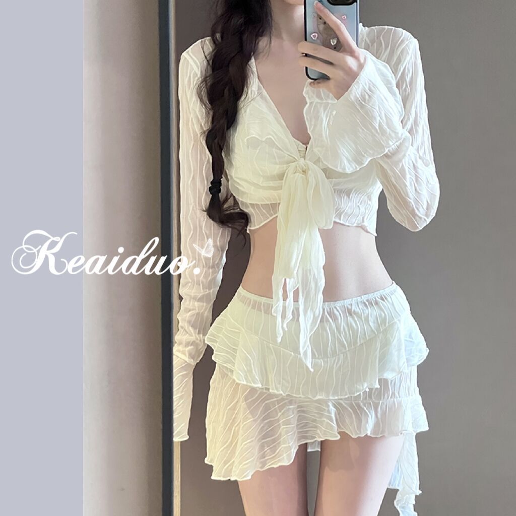 Set baju renang tiga potong wanita untuk perdagangan luar negeri Eropa dan Amerika tahun 2025 dengan penutup lengan panjang berpinggang tinggi, pakaian serut selebriti internet lintas batas.