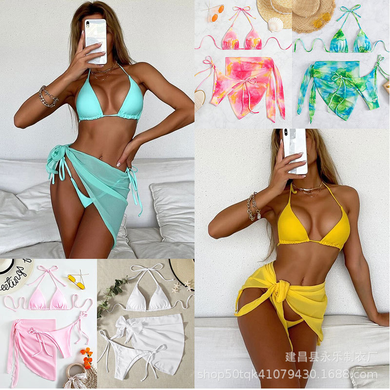 Perdagangan luar negeri Eropa dan Amerika dalam stok 2021 baru warna solid tali cangkir segitiga seksi bikini set tiga potong baju renang AliExpress