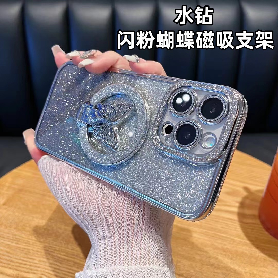 水钻边闪粉蝴蝶磁吸支架适用苹果17PRO防摔手机壳iPhone16保护套