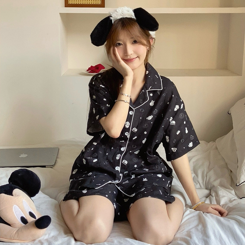 Pakaian Rumah Celana Pendek Lengan Pendek Katun Murni Miffy Bermain Hitam Gelap Lucu Musim Semi Musim Panas Baju Tidur Kelinci Bermain Kartun Set Dua Potong