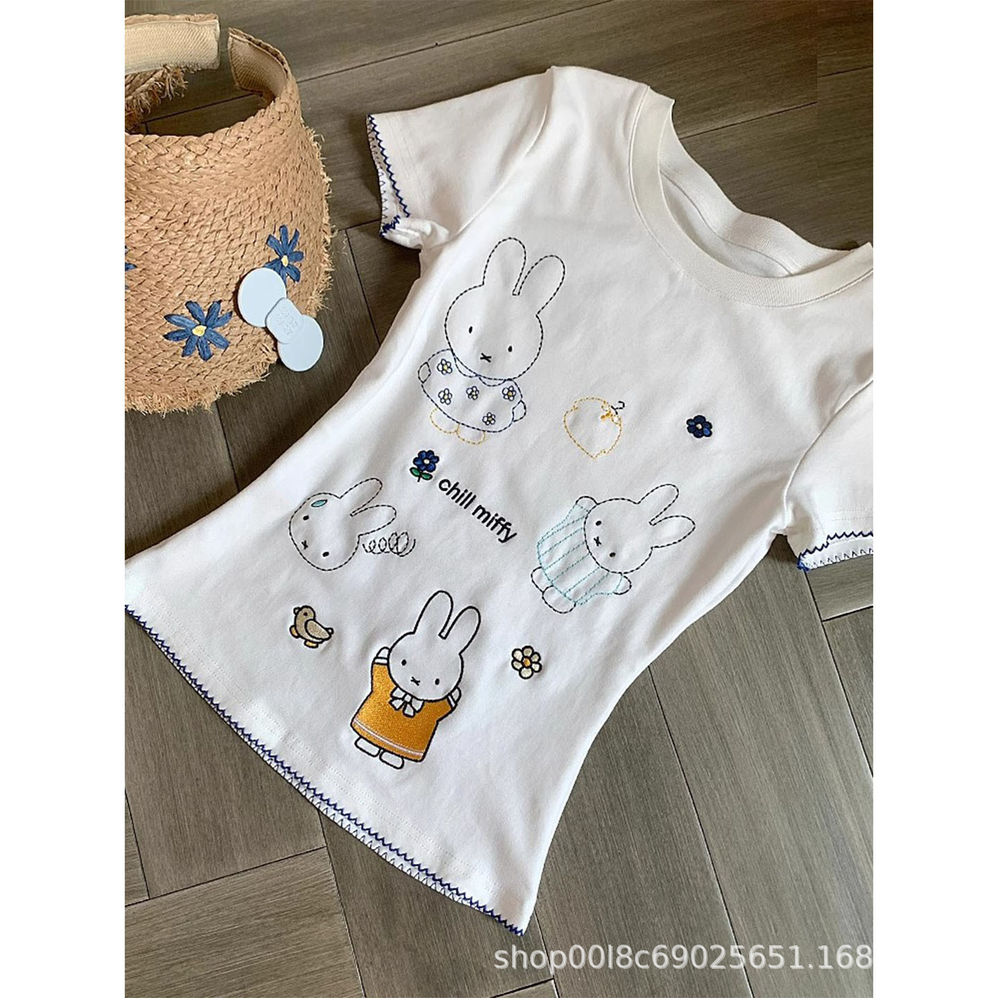 Atasan Ins Niche Ramping Model Baru Musim Panas Wanita T-Shirt Kerah Bulat Bordir Kelinci Mifofi Lucu Model Kartun Kelas Atas Korea