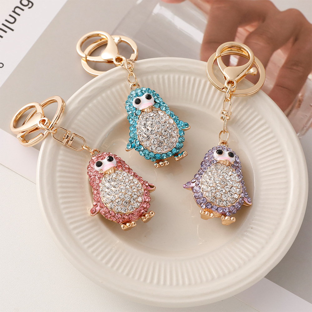 Grosir tas gantungan kunci mobil penguin lucu kartun tertanam berlian kreatif liontin logam rantai kunci hewan