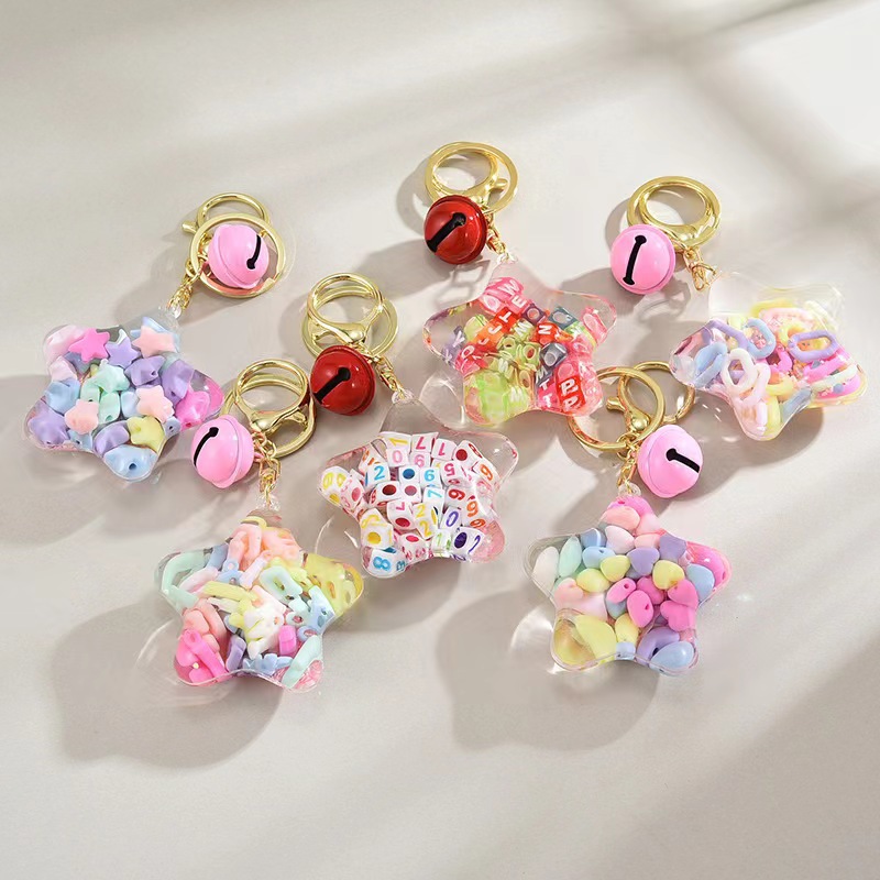 Gantungan kunci minyak lucu, Gantungan Kunci minyak pasir apung bintang lima titik, tas maca mengambang akrilik, rantai kunci boneka mobil