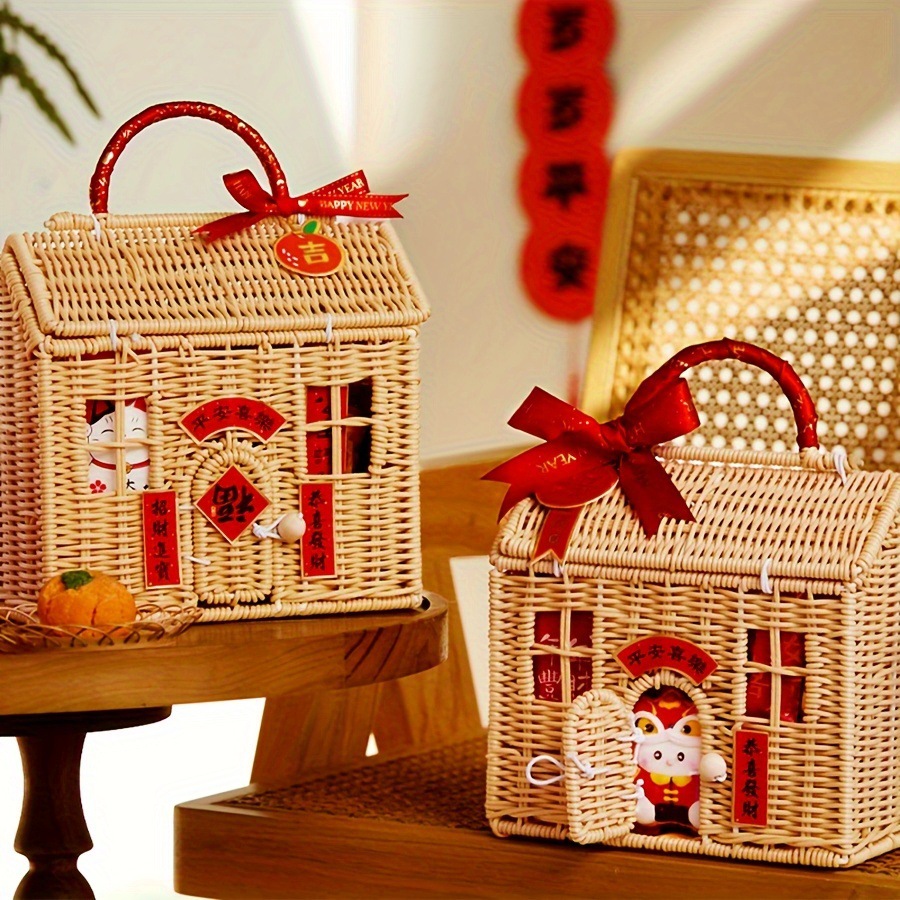 2025 Baru Rumah Kecil Keranjang Rotan Keranjang Hadiah Tahun Baru Kotak Kemasan Permen Rumah Kecil Rajut Simpul Kreatif