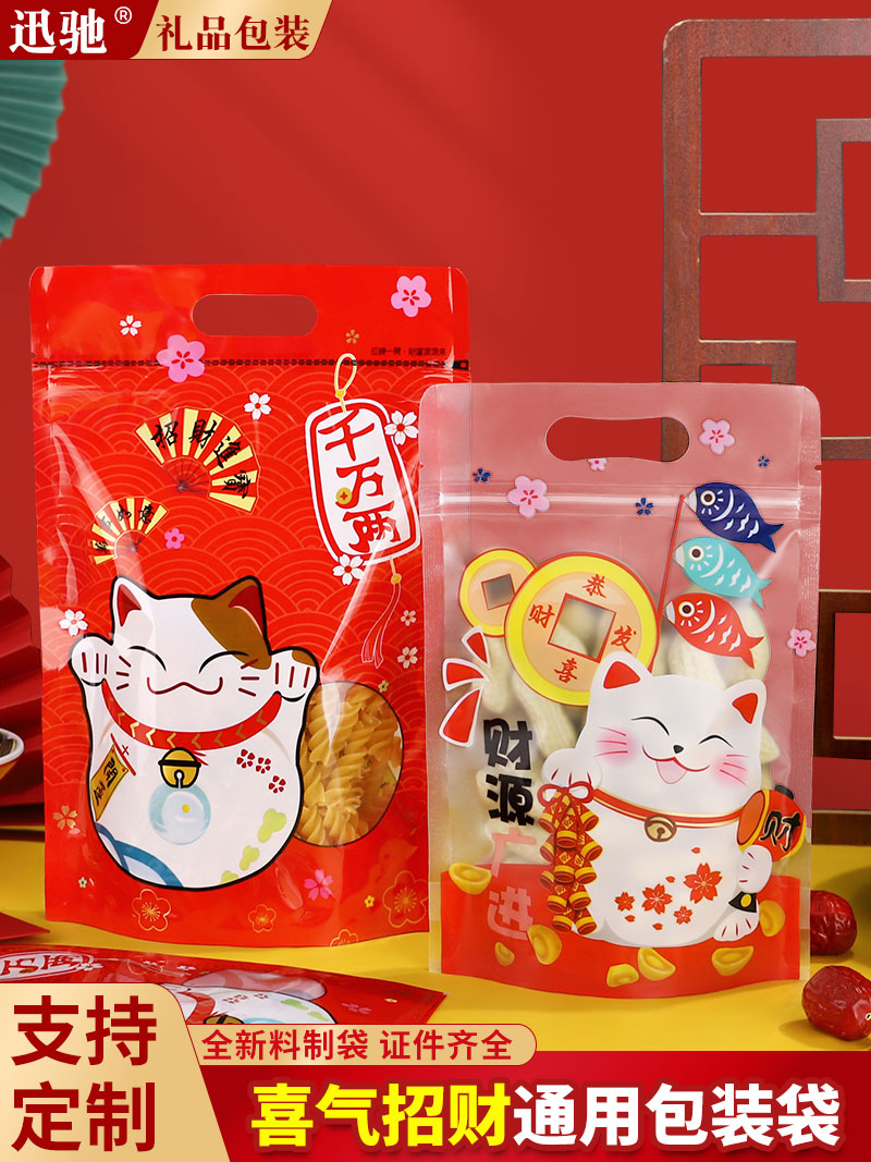 Tas kemasan permen kucing keberuntungan Tahun Baru tas ziplock kue kering kue kering kepingan salju tas tersegel portabel kacang buah kering