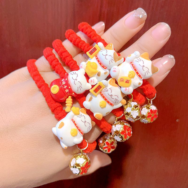 Bel kucing keberuntungan merah Tahun Baru gelang karet tali tebal cincin tali rambut siswa anak-anak tinggi elastis dasi ekor kuda aksesoris rambut liburan