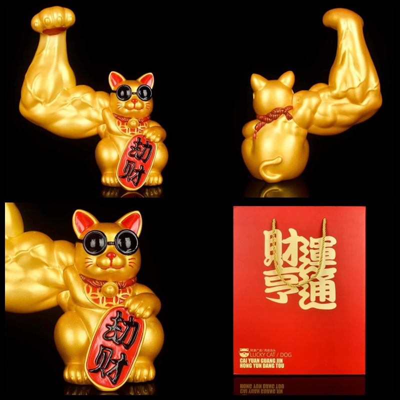 Boneka dekorasi kucing, kucing kaya lengan Kirin lengan keberuntungan kucing otot kuat Lengan raksasa ukuran kecil