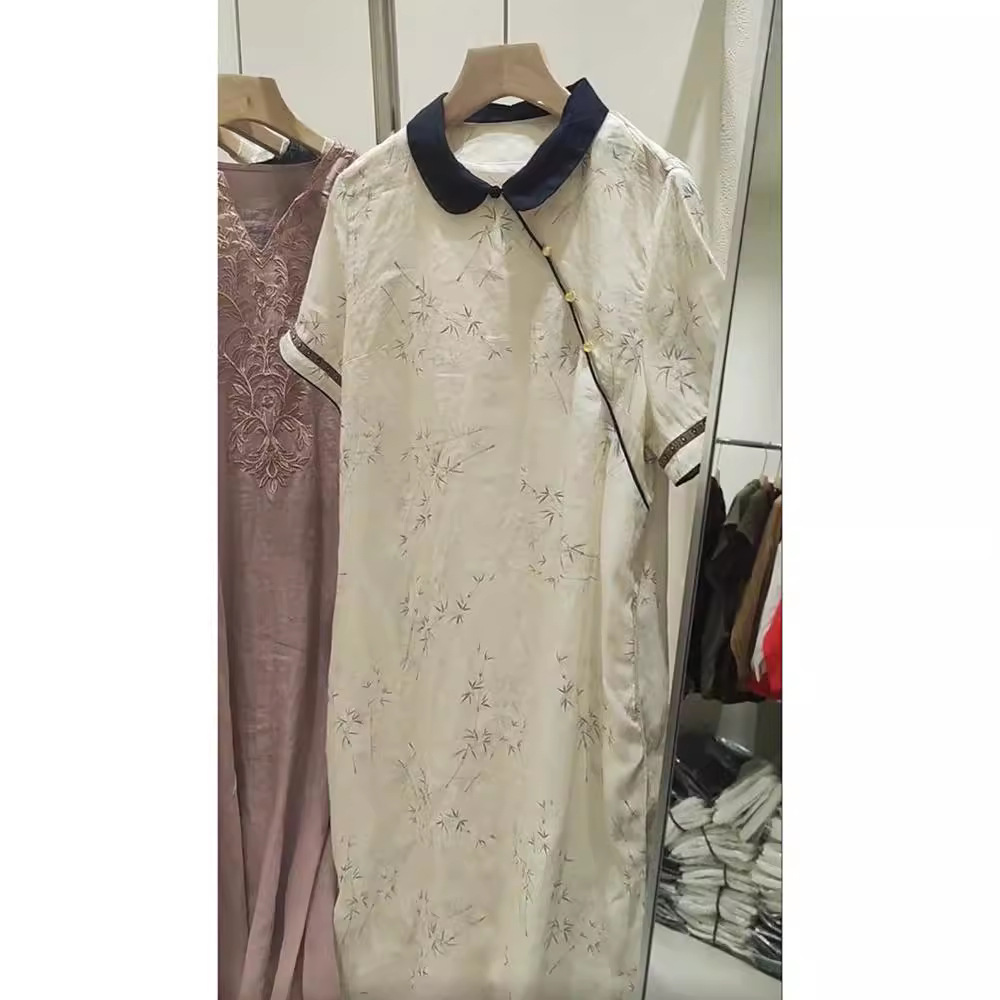 Gaun wanita dicetak elegan bergaya Tiongkok, Gaun wanita musim panas baru 2024, kerah berdiri, Rok cheongsam ditingkatkan, gaya Tiongkok