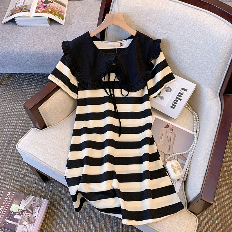 Gaun pelangsing kerah boneka wanita ukuran Plus gaun bergaris panjang menengah mengurangi usia anak perempuan gemuk musim panas