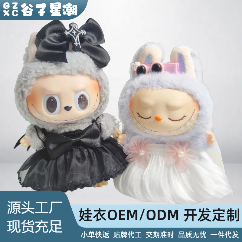 Pakaian boneka Labubu tersedia, vinil Labubu boneka 17cm, gaun lucu, rok, pakaian boneka mewah
