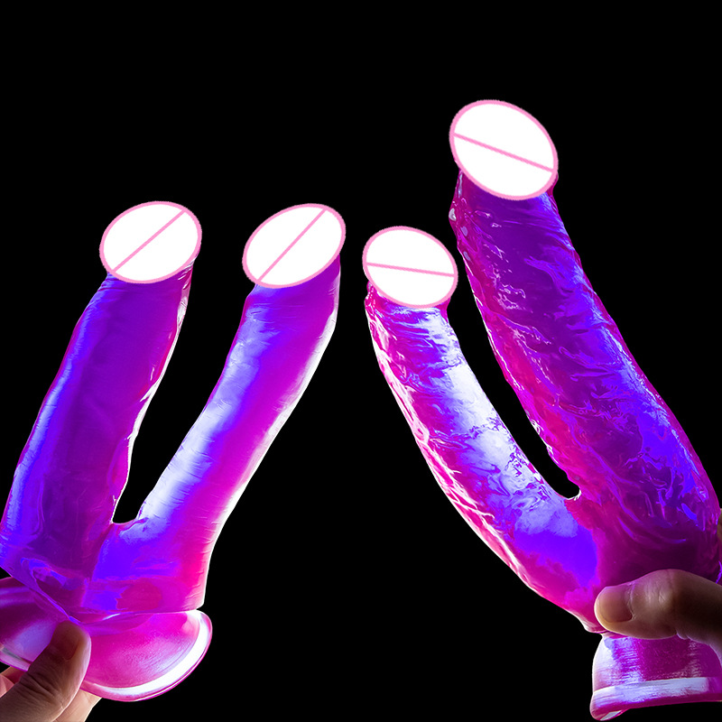 Dildo mainan penis buatan untuk wanita, dildo berkepala ganda berbentuk U masturbasi kristal warna-warni untuk wanita