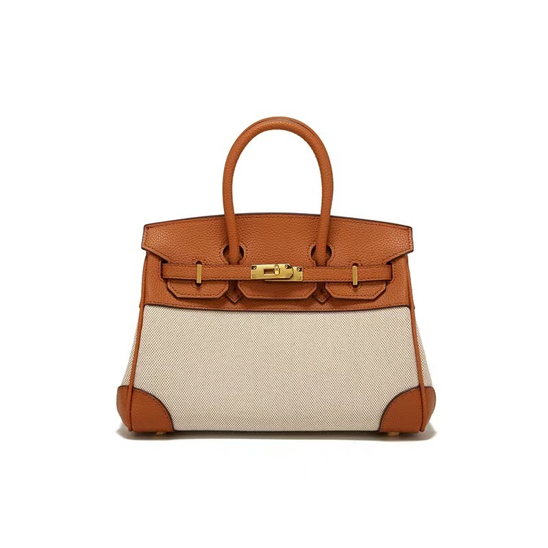 Tas Platinum Bahan Kanvas Kulit Sapi Pola Lychee Model Baru Tas Kontras Warna Sambungan Kasual Wanita Tas Selempang Bahu Tunggal Jinjing Kapasitas Besar