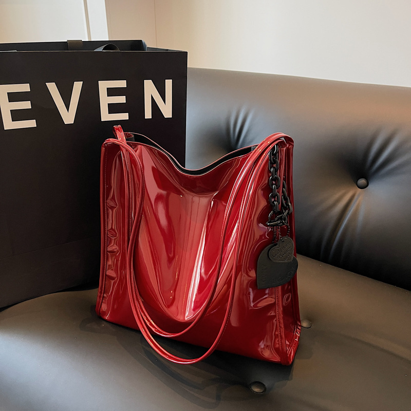 Tas tote kulit paten wanita, tas jinjing sederhana kapasitas besar warna polos musim gugur 2023