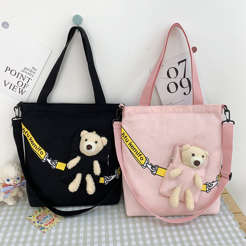 Tas selempang kapasitas besar, tas kanvas kapasitas besar, tas bahu belanja Mode Korea, tas selempang kanvas Beruang rantai lucu untuk pelajar
