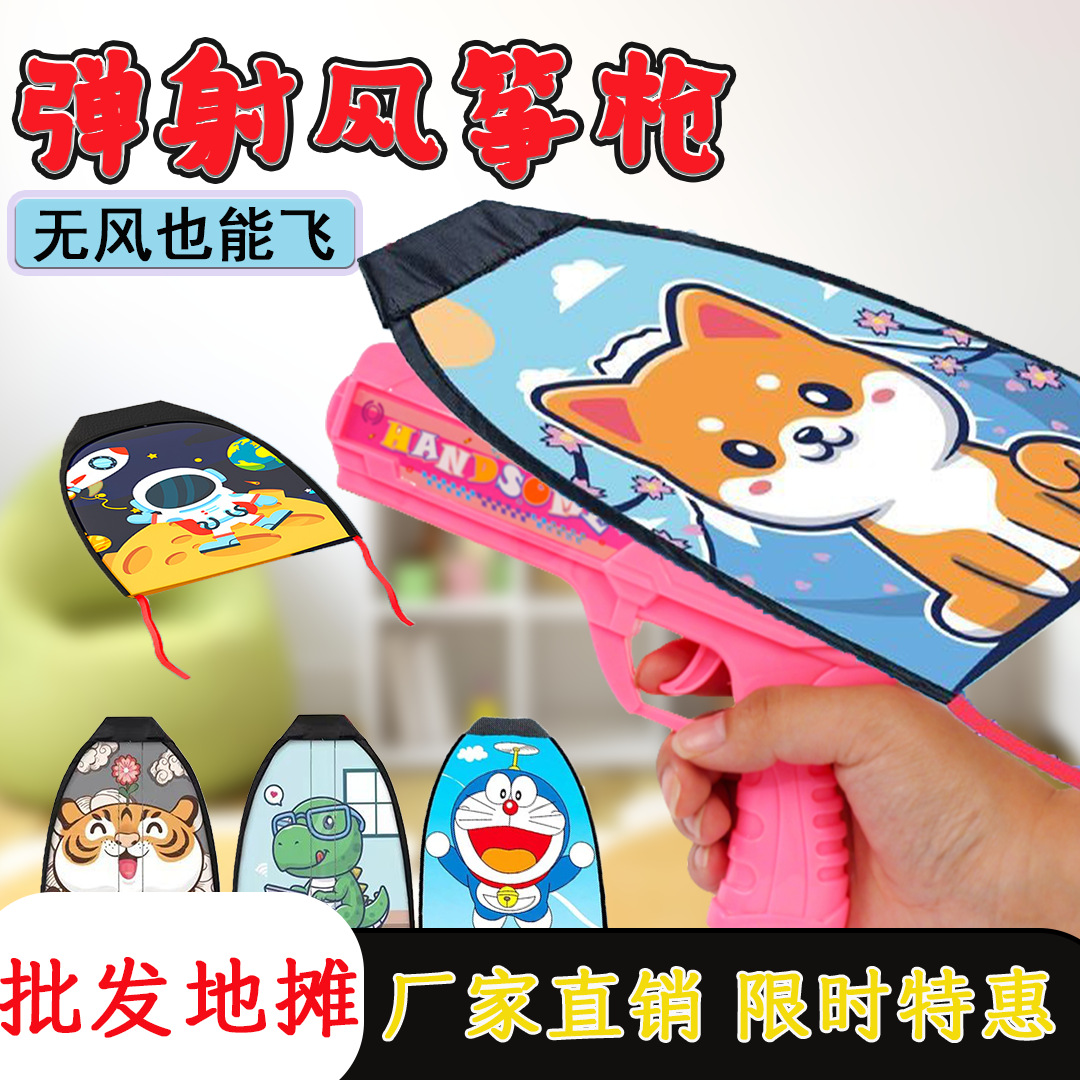 Anak selebgram melontarkan layang-layang dengan pistol meluncurkan layang-layang terbang anak laki-laki dan perempuan di luar ruangan mainan olahraga kios grosir