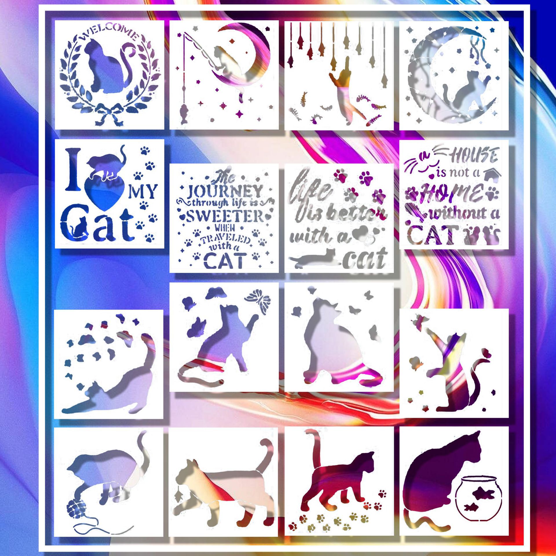 Templat lukisan berongga 16 kucing untuk anak pelajar lukis tangan pola DIY alat bantu grafiti salinan