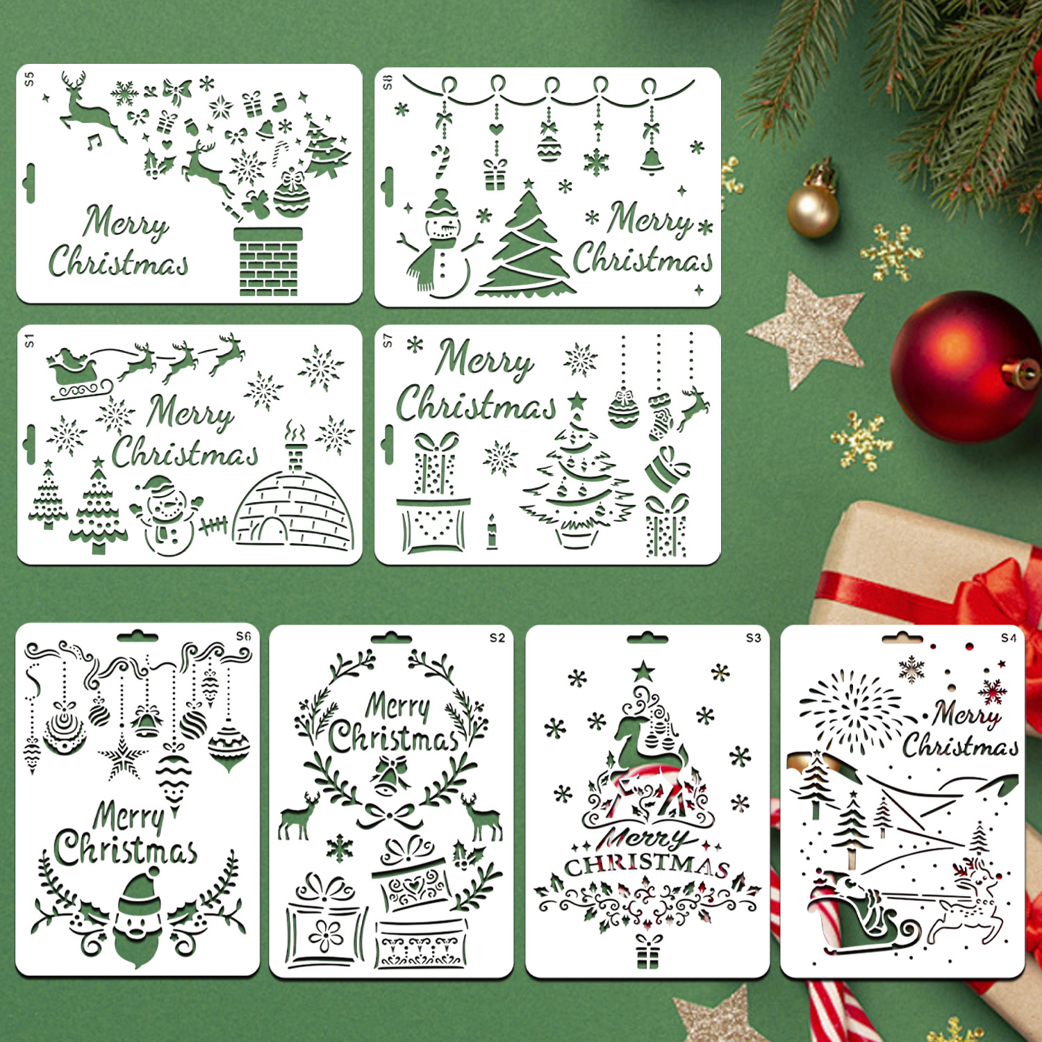 8 gambar utama Natal templat lukisan berongga anak-anak pelajar dilukis tangan pola DIY alat bantu grafiti salinan