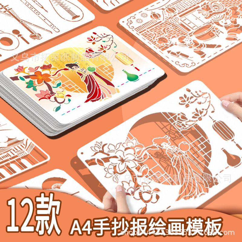 Templat lukisan gaya nasional A4 ditulis tangan anak-anak koran kreatif lukisan DIY lanskap, kostum kuno grafiti akun tangan