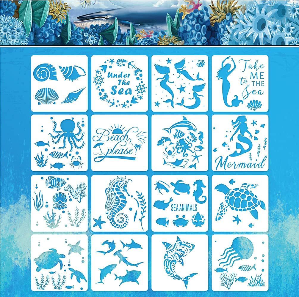 Templat lukisan akun tangan anak-anak, tema laut 16 buah lukisan stensil laut putri duyung